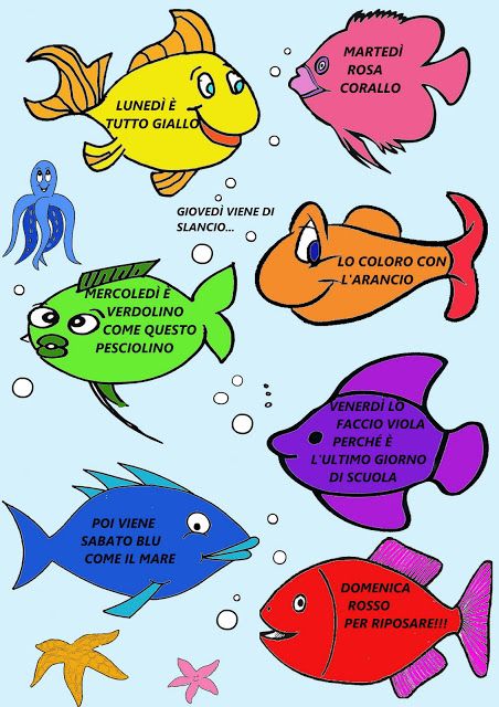 PRENDETE 7 FOGLI BIANCHI DELLO STESSO FORMATO , DISEGNATE AL CENTRO E SU OGNI FOGLIO UN PESCE E OGNI GIORNO COLORATELO CON IL COLORE DELLA GIORNATA. IN ALLEGATO TROVATE IL MODELLO DI UN PESCE, EVENTUALMENTE DA COPIARE O STAMPARE . POCO PER VOLTA REALIZZEREMO UN BELLISSIMO LIBRICINO! BUON DIVERTIMENTO ![]()